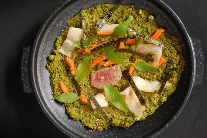 Hoặc ăn 1 mình với rau củ chua và rong biển, lá thơm như pizza.